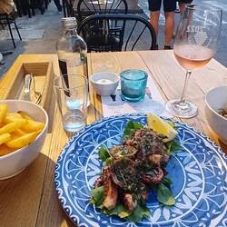 Da verzehre ich dann lecker würzige Anchovies und zum Hauptgang in Knoblauch und Kräuter gebratenen Oktopus....
