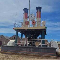 Eine große Dampfuhr...markiert das Ende oder Anfang des Hafens....