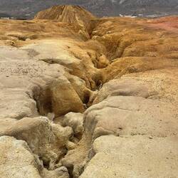 Die Minen sind Industrieruinen und keine Touristenattraktion. Entsprechend gibt es keinerlei Absperrungen, etwa bei losem Untergrund oder tiefen Löchern zu den früheren Stollen. Wir schauten vomLeia mais