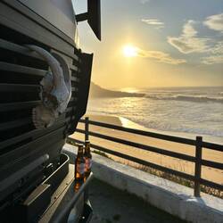 Wir grillen ein leckeres Fleisch von Kastanienschweinen und genießen das Wetter und die grandiosen Wellen 🌊