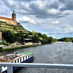 Vor einem niedlichen Ort mit alten Häusern sahen wir eine schöne, moderne Brücke. Welches Bächlein wird wohl hier überbrückt?? Wir waren sehr überrascht, denn es war die Moldau. Kleiner undMeer informatie