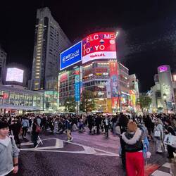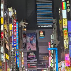 We saw this famous building with a godzilla head reaching over it and the Shibuya crossing, were tons of people walk the street.
