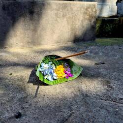 Over all of Bali I say many of little Plant Bundles with flowers and Rice and other stuff in it. I later asked a Local Woman about it and she explained it that its called "Canang Sari" and its a daily offering to the gods that expresses thankfulness to the supreme deity (Sang Hyang Widhi Wasa) for life, safety, and prosperity.