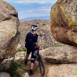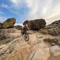 Zum Start probieren wir einen blauen Trail direkt vom Camper weg – perfekt zum Eingewöhnen. Anfangs traue ich den Felsen nicht so recht, aber Alex zeigt mir, wie unfassbar viel Grip sie haben. Ab da wird’s immer besser und am Ende einfach nur noch Spaß.