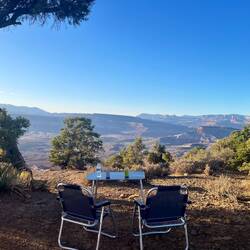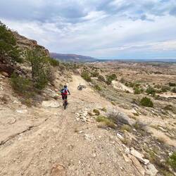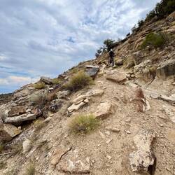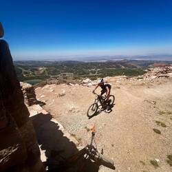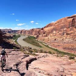 Weiter geht’s mit dem legendären Enchilada – eigentlich über 40 km lang, für uns nur ein Teilstück, weil die Shuttles keine E-Bikes transportieren. Früh am Morgen kurbeln wir hoch, die letzten 300 Höhenmeter werden geschoben, getragen und geflucht – alles dabei. Oben gibt’s Aussicht deluxe und eine wohlverdiente Pause, bevor die Abfahrt startet: technisch, spaßig, mit einer Kulisse wie aus dem Bilderbuch. Unten spuckt uns der Trail direkt am Colorado River aus – Postkartenmotiv pur! 😍 Die Wärme zum Ende hin ist fast unerträglich, und wir sind froh, dass wir so früh los sind.