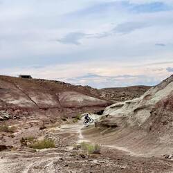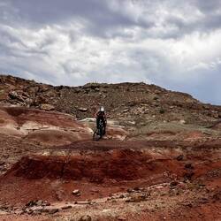 Und weil wir es wirklich wissen wollten, probieren wir am nächsten Tag noch den Moab Rim Trail. Am Abend zuvor hatten wir gesehen, wie zwei Buggies mit Licht den Berg hinuntergerast sind, also dachten wir: „So schlimm wird’s schon nicht sein.“ Falsch gedacht. Der Trail geht nur schwarz rauf und wieder runter – und schon die ersten Meter sind echt heftig. Schieben, tragen, wieder schieben kurz fahren – wirklich fahren? Ehrlich gesagt, wenig. Unterwegs treffen wir zwei Motocross-Fahrer, die auch ordentlich kämpfen mussten. Irgendwann brechen wir ab – zu viel Hitze, zu viel Schlepperei. Aber die Aussicht von oben? Gigantisch! Runter gibt’s dann immerhin noch ein paar spaßige Passagen.