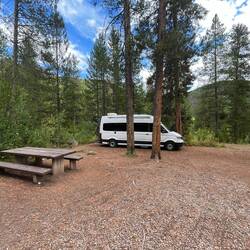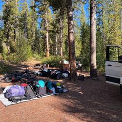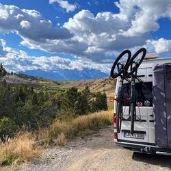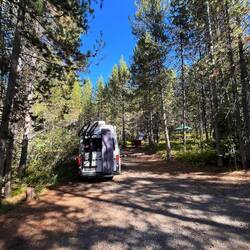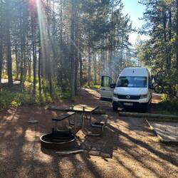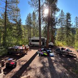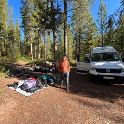 Unser Lager und Basecamp für die nächsten Tage ist der Allred Flat Campground – mitten im Wald, ruhig und abgelegen, kurz vor den Nationalparks Teton und Yellowstone. Perfekt, um das Chaos anzugehen und zu hoffen, dass alles passt.