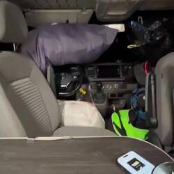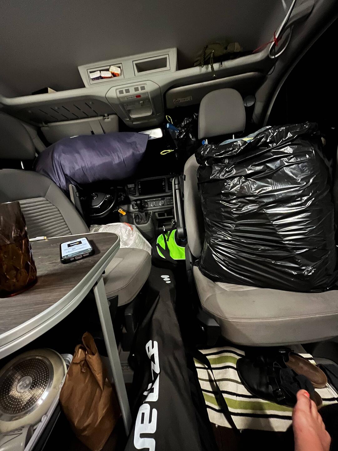 Und jetzt? Statt Vorfreude erstmal pures Chaos. Im Camper ist kein Platz zum Bewegen, alles vollgestopft. Also raus aus der Stadt, Campingplatz suchen, Augen zu und schlafen. Das große Sortieren muss warten – irgendwie kriegen wir das schon hin. 😉