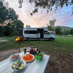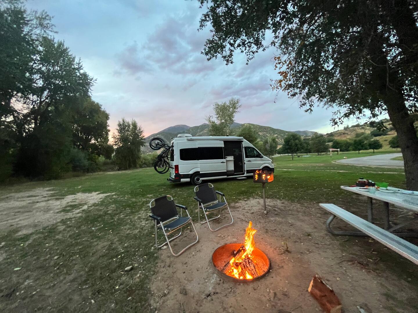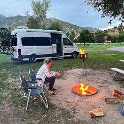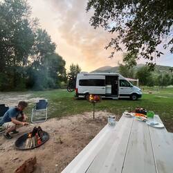 Auf dem Weg nach Salt Lake City gönnen wir uns noch einen Stopp auf einem Campingplatz mitten im Grünen. Einmal durchatmen, grillen, Feuer machen und die warme Abendluft genießen – bevor der Sommer endgültig vorbei ist und die Nächte kälter werden. 🔥🥩☀️ Außerdem: das restliche Holz muss weg, schließlich brauchen wir jeden Zentimeter Platz für die Wintersachen aus dem Storage.