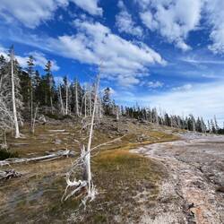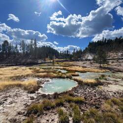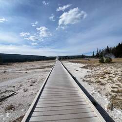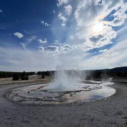 Der erste Tag steht ganz im Zeichen der Geysire. Thumb, Old Faithful & Co. – und natürlich DAS Spektakel am berühmtesten aller Geysire: Old Faithful. Der bricht alle 90 Minuten aus und mit der App vom Park kannst du sogar checken, wann genau es so weit ist. Wir standen mit unzähligen anderen Menschen dort, alle gespannt wie kleine Kinder – und dann plötzlich: Wasser, Dampf, Fontäne in den Himmel. Gänsehaut pur.