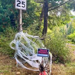 Schon am Parkplatz merken wir schnell: auch hier ist einiges los. Viele Biker, viele Locals – und wir spüren sofort, dass der Spot ein guter Tipp war. Also rein in die Klamotten und rauf aufs Bike. Auf dem Weg zum Traileinstieg entdecken wir die ersten Halloween-Dekos – schade, dass wir dieses Spektakel nicht mehr miterleben werden, das wäre sicher richtig cool geworden. 🎃👻