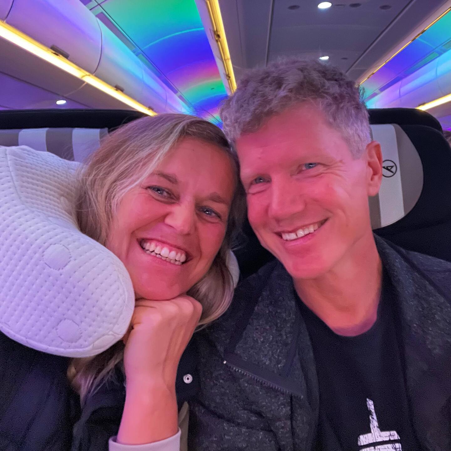 Der Flug? Mit XXL-Beinfreiheit und Disco-Partylicht im Flieger – genauso bunt wie unsere letzten Monate. 🎉