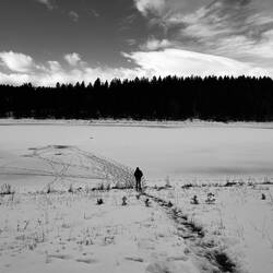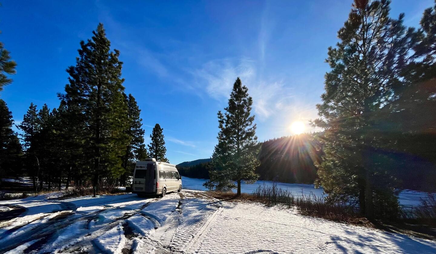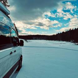 Der Morgen beginnt ruhig. Die Sonne scheint über den zugefrorenen See, alles glitzert ein bisschen im Licht und es ist komplett still. Kein Mensch weit und breit. Nur wir, der Camper und diese unglaubliche Weite.