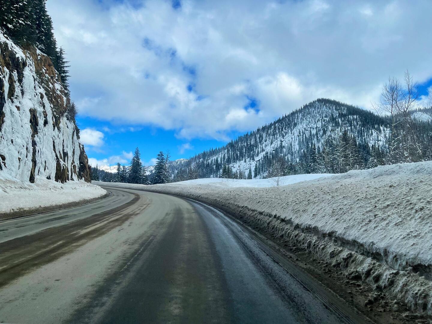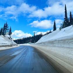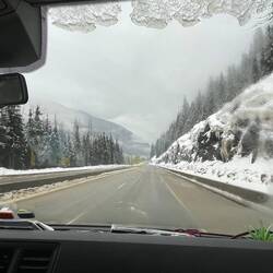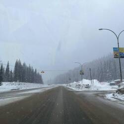 Über Nacht hat es ordentlich geschneit und die ganze Landschaft ist plötzlich wieder tief winterlich. Schon irgendwie ironisch – kaum haben wir Revelstoke und dem Skifahren den Rücken zugewandt, meldet sich der Winter nochmal zurück.