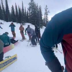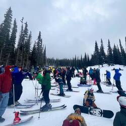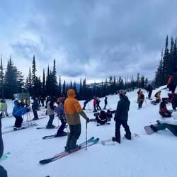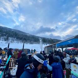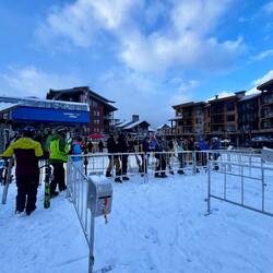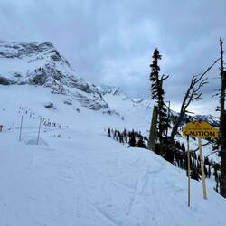Also früh raus und ab zum Lift. Natürlich nicht alleine – an solchen Tagen ist ganz Revelstoke auf dem Berg. Die Schlange ist da, aber ehrlicherweise nicht so schlimm wie gedacht. Wir stellen uns etwa 45 Minuten vor Liftöffnung an. Und trotzdem stehen schon einige vor uns. Die Frage bleibt: Wann bitte kommen diese Leute? 😅