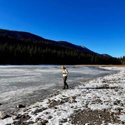 Am nächsten Morgen haben wir uns auf einen Kaffee getroffen ☕ und beschlossen, den Tag ganz entspannt anzugehen. Also ab nach Whistler Village 🏔️, ein bisschen bummeln, danach ein kleiner Spaziergang am See 🌊❄️ – einfach genießen.