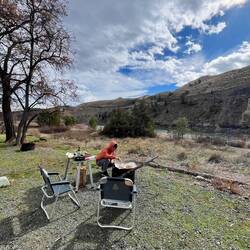 Am nächsten Morgen scheint die Sonne und wir nutzen das schöne Wetter erst einmal, um den Camper komplett auszuräumen, alles neu zu sortieren und wieder einen Überblick über unsere Vorräte zu bekommen. Danach machen wir es uns gemütlich, entzünden ein kleines Feuer 🔥🪵 und genießen die Mittagssonne 😎☀️. Dazu etwas vom Grill 🥩, Blick auf den Fluss – und trotz der vorbeiziehenden Züge hat dieser Platz seinen ganz eigenen Charme.