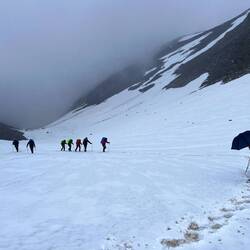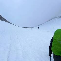 Nach der Pfandlscharte ging es noch über ein paar weitere Schneefelder langsam bergab. Das Schneetreiben hörte langsam auch und der Wind wurde auch weniger.