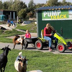 Ein großer Innen- und Außenspielplatz mit allerhand Rutschen, Trampolinen, Klettermöglichkeiten und Tieren.