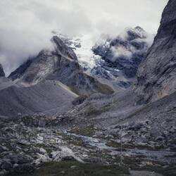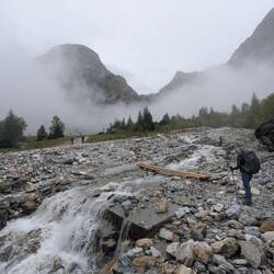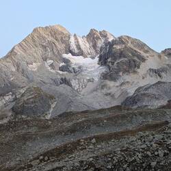 Der heutige Streckenabschnitt weist im Vergleich zum Vortag weniger Höhenmeer aufwärts auf (450 hoch, 550 runter), ist mit rund 13,2 Kilometern aber auch ein ganzes Stück länger. Wir entfernen uns nur vom nördlichsten Punkt der Glaciers-Rundtour am Lac des Vaches, den wir gesten passiert haben, und bewegen uns nun die kommenden drei Tage Richtung Südsüdwest und Südwest. Die über 13 Bergkilometer durch teilweise nur sehr langsam begehbare Geröllfelder fordern Konzentration und Zeit. Unsere reine Wanderzeit beträgt 6.15 Stunden, inklusive Pausen sind wir 8 Stunden auf der Strecke.