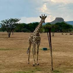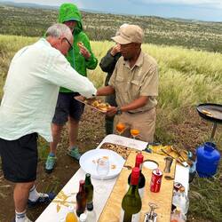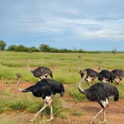 Eigentlich waren wir auf der Durchreise und mussten am Abend in den Etosha-Nationalpark. Geplant war aber noch eine Safari am Abend im Sophienhof. Doch das Wetter machte uns einen Strich durch die Rechnung, und die geplante Safari stand auf der Kippe und schien im wahrsten Sinne des Wortes ins Wasser zu fallen. Kurzerhand wurde uns eine vorgezogene Tour extra für uns angeboten – mit Regencapes ausgestattet machten wir uns auf den Weg. Der Boden war aufgeweicht, an einigen Stellen sanken wir beinahe ein. Doch die Mühe zahlte sich aus: Nach dem Passieren von zahlreichen Herden haben wir nach langem Suchen auch die Nashörner entdecken können.