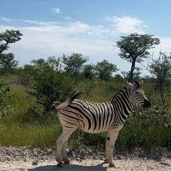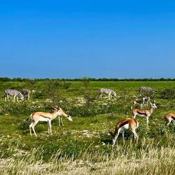 Am Ende ging es dann für uns weiter zum Etosha-Nationalpark. Auf der Fahrt ist jedoch passier, wovor wir die ganz Zeit Panik hatten. Die geteerten Straßen in Namibia sind nicht sehr breit und aufgrund des anhaltenden Regens der letzten Wochen ist das Gras am Straßenrand sehr hoch gewachsen und lässt kaum eine Chance Wildwechsel früh zu erkennen. Und so passierte, was passieren musste. Aus dem Nichts kam plötzlich eine Hyäne und lief uns direkt mit ihrem Kopf an die Stoßstange. Im Rückspiegel war nur noch das Wegschlittern des Kadavers zu sehen - und es war klar, jede Hilfe wäre vergebens. Mit diesem Schock haben wir uns in den ersten Safari-Abend verabschiedet.