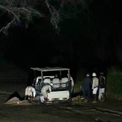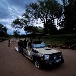 Doch dann passierte das Unerwartete: Unser Fahrzeug blieb im schlammigen Flussbett stecken. Zunächst konnten wir uns noch durch ein kurzes Rückwärtsmanöver befreien. Zuerst dachten wir es sei eine scherzhafte Showeinlage unseres Guides, da wir leider keine Tiere auf der Safari sehen konnten. Doch einige Minuten später steckten wir endgültig fest – und das in der Dämmerung. Die Dunkelheit kroch unaufhaltsam heran, und mit ihr die Erkenntnis: Hier kommen wir nicht mehr allein raus. Ein Notruf wurde abgesetzt und die Nacht wurde pechschwarz. Lediglich die Blitze der umliegenden Gewitter waren ab und an eine Erleuchtung für uns, auch wenn ein Blitz unweit von uns einzuschlagen schien. Es hätte an der Stelle eh kein Unterschied gemacht ob der Blitz direkt in uns einschlägt oder im Auto. Zu dem Zeitpunkt standen wir schon im halbnassen Flussbeet und der Safari-Waagen hätte auch keinen Schutz geboten.