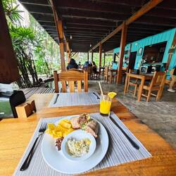 Our guide then took us to our next minibus and we headed towards Puerto Viejo. I had decided to take the 'Caribe Shuttle Service' as there was a two-hour stopover in Puerto Viejo with lunch included. As Lisa had already been there once and had reported a lot of positive things about it, I wanted to at least take advantage of the opportunity to get a little insight. We arrived at the 'Banana Azul' hotel at around 10:40 am, where we had lunch at around 11:30 am - vegetarian wraps with banana chips and salad 🌯