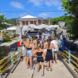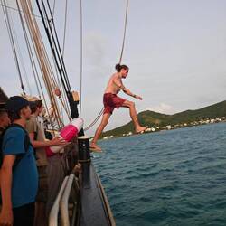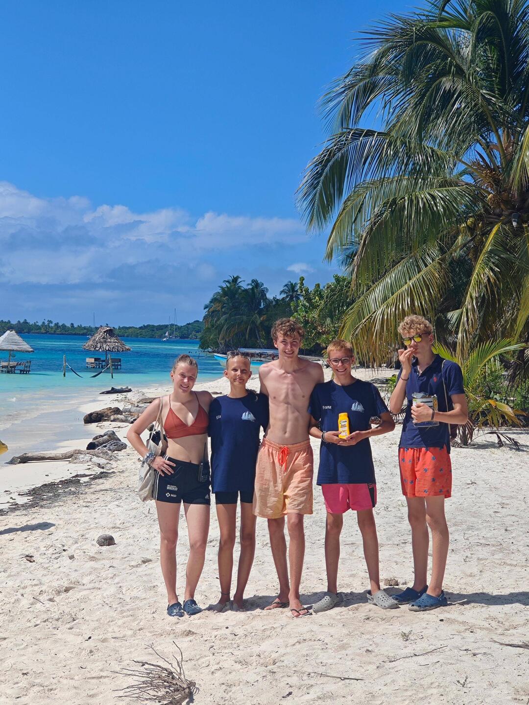 The last group arrived safely back on land at around 5 pm. While we waited for each other, we got talking to various locals and their children. The children then started to play soccer around us and with us as a result. Afterwards, they wanted to climb on our shoulders to pick flowers from a nearby tree. Not surprisingly, the kids stole one or two Cappi, threw them back and forth and hid them. The rest of the evening took on an unforeseen dynamic of its own, which, after 20 years of camp experience, reminded me of nothing more than a normal 'camp day'. Children playing and running around, the occasional volleyball and basketball match and lots of kids on the shoulders of 'grown-up kids' (crew members, teachers and pupils alike), who all had a wonderful time together. A Caribbean vacation fun day that everyone involved will truly remember for a long time to come 💖