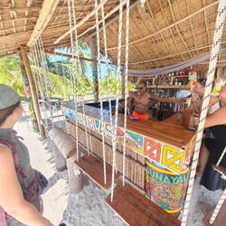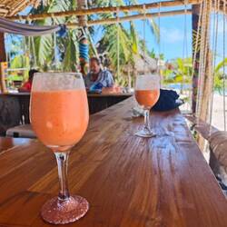 Wir setzten uns zunächst an eine kleine Strandbar/-hütte, an der man auf einer Schaukel direkt an der Theke sitzen konnte. Für das ultimative Paradiesgefühl bestellten wir uns einen Erdbeer-Mango-Kokosnuss-Smoothie und genossen das Wetter, die Umgebung und den 'Vibe' der Insel. Irgendwann wechselten wir dann zu den Sitzbänken ins Wasser und konnten unsere Anwesenheit an diesem Fleckchen Erde kaum fassen 🏝️🍹