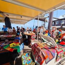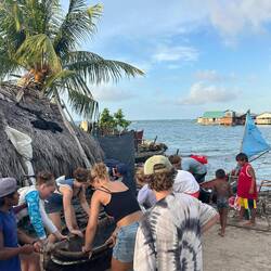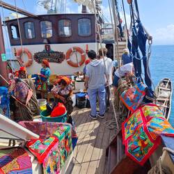 Die Überfahrt dauerte etwa 3 h und wir warfen gegen 13:00 Uhr den Anker. Unser Plan: In El Porvenir für unseren Landaufenthalt in Bocas del Toro (ebenfalls Panama) bereits vorab einzuklarieren, um Zeit zu sparen. Bevor Marie, Maxim und Kaspar allerdings von Bord gehen konnten, um diesen Prozess in Angriff zu nehmen, geschah das, worauf uns Marie bereits vorbereitet hatte. Innerhalb weniger Minuten nach Ankunft verwandelte sich das Maindeck unserer Regina Maris zu einem großen Basar. Diverse Arten von Schmuck, Tüchern, Taschen und handwerklichen Schnitzereien (Miniaturboote etc.) sowie Fisch wurden angeboten. Die Schüler*innen waren sehr verblüfft, aber auch beeindruckt von der Vielfalt sowie den Formen und Farben der angebotenen Waren ❇️🏳️🌈