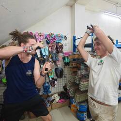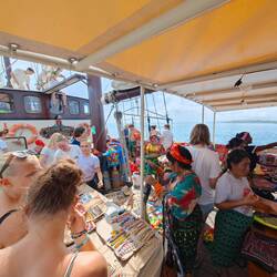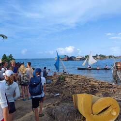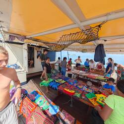 The crossing took around 3 hours and we dropped anchor at around 13:00. Our plan was to check in at El Porvenir in advance for our land stay in Bocas del Toro (also in Panama) in order to save time. However, before Marie, Maxim and Kaspar could disembark to tackle this process, what Marie had already prepared us for happened. Within minutes of our arrival, the main deck of our Regina Maris was transformed into a huge bazaar. Various types of jewelry, scarves, bags and handicraft carvings (miniature boats etc.) as well as fish were on offer. The students were amazed, but also impressed by the variety, shapes and colors of the goods on offer ❇️🏳️🌈