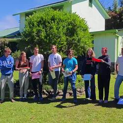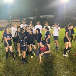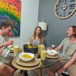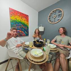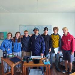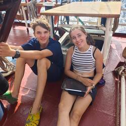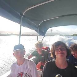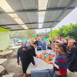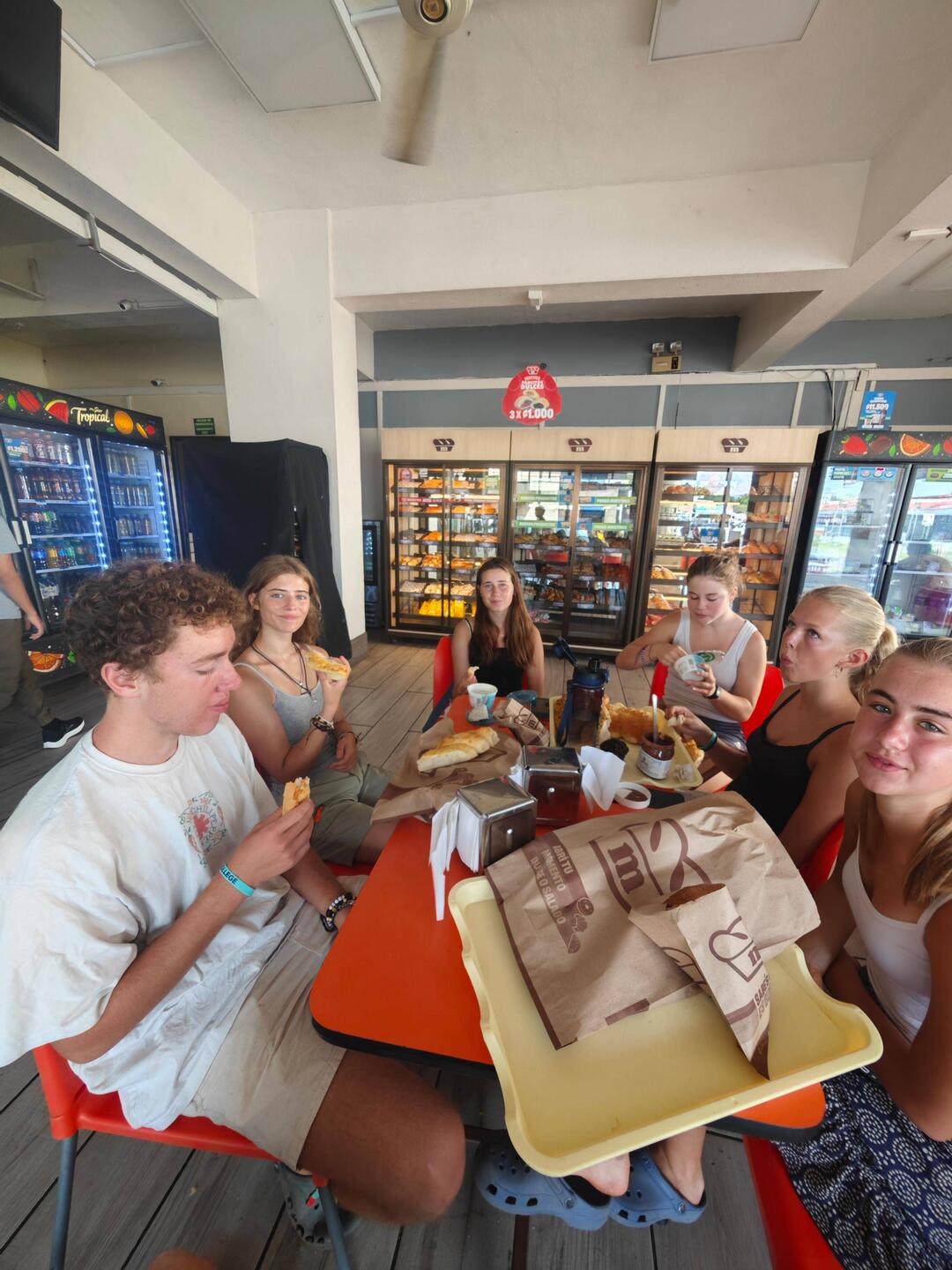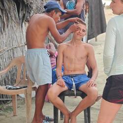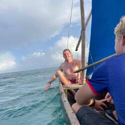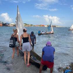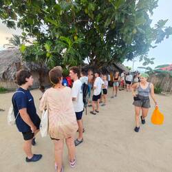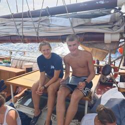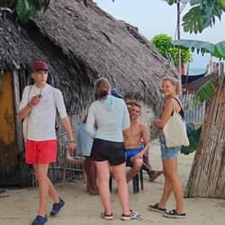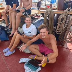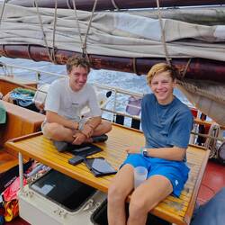 Um kurz nach 10 Uhr holten Heine sowie Arne und Raphi jeweils mit beiden Dingis die Kids der lokalen Volleyballmannschaft (Alter zwischen 14-19 Jahre) ab. Nach einer rasanten und spaßigen Dingifahrt kamen die Kids an Bord an und Martin, unser Koch, hieß alle herzlich auf unserer Regina willkommen. Er erzählte zunächst - in fließendem Spanisch - was genau wir hier eigentlich machen und was das Projekt 'Ocean College' bedeutet. Danach gab es in zwei Kleingruppen jeweils von Martin und Kaspar eine Führung über das Schiff. Nach einer kurzen Verschnaufpause mit Wasser und ein paar Süßigkeiten, übergab uns dann der Trainer der Mannschaft einen handgeschriebenen Brief, in dem er um Spenden für einen neuen Trikotsatz aufgrund eines größeren Turniers, an dem sie bald teilnehmen wollen, bat. Alle, die etwas dazu beitragen wollten, konnten etwas in eine kleine Spendenbox werfen. Diese wurde dann kurz vor Abfahrt dem Trainer und der Mannschaft ausgehändigt. Vorher sangen uns zunächst die lokalen Kids mit ihrem Trainer einige Lieder in ihrer Landessprache vor. Im Anschluss daran griff dann auch Anneke zur Gitarre und gab mit unseren Schüler*innen ein paar Songs zum besten. Nach etwa 1 1/2 h an Bord wurden die Kids von Arne und Raphi sowie Heine wohlbehalten zurückgebracht 🚤