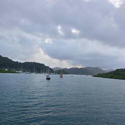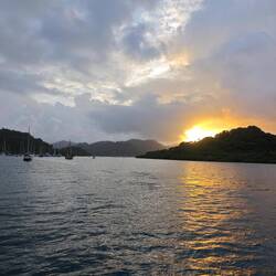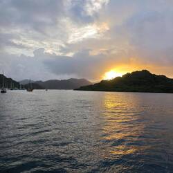 Nach etwa 4 h Fahrt kamen wir noch kurz vor Sonnenuntergang in Linton Bay an und warfen für diese Nacht in der Bucht vor der Marina den Anker. Lisa, Heine, Marie und Arne fuhren an Land, um uns für die Diesellieferung am nächsten Morgen anzumelden. Nach dem Abendessen sind wir gemeinsam als Crew (Arne, Heine, Esther, Marie, Martin, Kaspar, Maxim, Lisa und ich) noch zum einzigen Restaurant im Hafen gefahren. Raphi blieb unterdessen auf dem Schiff, um noch kleinere Wehwehchen zu behandeln und auf die Kids aufzupassen 🧑🏽⚕️