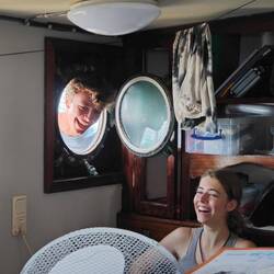 At around 07:30 the next morning, we entered the port right next to the fuel pump. The students were given free shore leave for the duration of the refueling. Unfortunately, there wasn't that much to discover here. There was a restaurant (where we sat yesterday and which was still closed), a kind of 'petrol station store' and an ATM. But it was a good and welcome change to stretch our legs. However, not all students and teachers were able to take full advantage of this shore leave, as little Marie still had to write an English test for a competition - that's how it can be at Ocean College. Shortly after the end of the processing time, Arvid wanted to find out how Marie was 'feeling' after handing it in, and how do you do that on a ship? - You stick your head through a porthole and ask directly and uninhibitedly (see photo). A very surprising and amusing moment for everyone in the room 👀