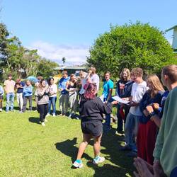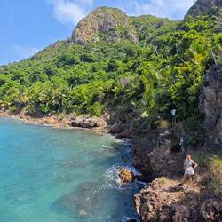 Nach einem wieder einmal fulminanten Frühstück von Rainer ging es für uns um 10:30 Uhr mit dem Dingi an Land. Nachdem die letzte Fuhre angekommen war, brachen wir zunächst um 11:00 Uhr auf eine Gemeinschaftswanderung zum 'Morgan's Head' am nordwestlichen Rand der Insel auf. Ein - wie sich noch herausstellen wird - treuer Begleiter folgte uns auf unserem Weg und bewirkte eine wahre Fürsorgewelle bei allen Schüler*innen. Kurzerhand mit dem Namen 'Timo' versehen, ging 'unser' Hund über Stock und Stein mit uns bis zum Ziel unseres Vorhabens. Dort fanden wir eine wunderschöne Aussicht auf eine nahegelegene Bucht vor und legten erst einmal eine ca. 40-minütige Pause ein. Einige nutzten diese Zeit, um ihr Lunchpaket zu verspeisen oder die Umgebung noch etwas zu erkunden 🚶🏽