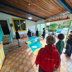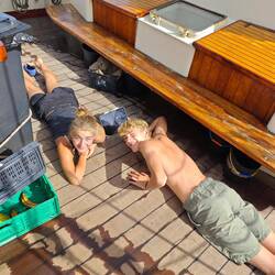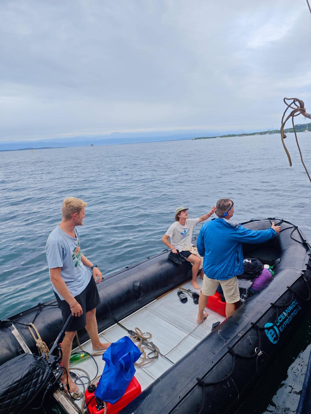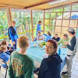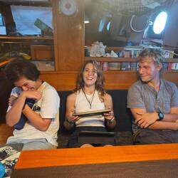 Shortly after 10 a.m., Heine, Arne and Raphi picked up the kids from the local volleyball team (aged 14-19) in both dinghies. After a fast and fun dinghy ride, the kids arrived on board and Martin, our cook, gave them all a warm welcome on our Regina. He began by explaining - in fluent Spanish - what exactly we are doing here and what the 'Ocean College' project means. Afterwards, Martin and Kaspar each gave a tour of the ship in two small groups. After a short breather with water and a few sweets, the team coach handed us a handwritten letter asking for donations for a new kit for a major tournament they are planning to take part in soon. Anyone who wanted to contribute could put something in a small donation box. This was then handed over to the coach and the team shortly before departure. Beforehand, the local kids and their coach sang a few songs in their local language. Anneke then picked up her guitar and performed a few songs with our students. After about 1 1/2 hours on board, the kids were brought back safe and sound by Arne and Raphi as well as Heine 🚤