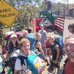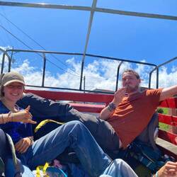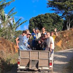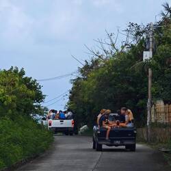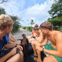 'Der Bus' bestand aus drei Pickups, die uns um die Insel fahren sollten. Wir teilten uns entsprechend auf und auch Timo ging mit uns zu unserem Pickup. Auf die kurze Nachfrage von Roland, ob dies unser Hund sei, antworteten die Schüler*innen - ganz selbstverständlich- mit "Yes, of course". So hüpfte Timo fix in unseren Pickup und genoss den außergewöhnlichen Ausflug sichtlich 🐶