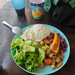 Our guide then took us to our next minibus and we headed towards Puerto Viejo. I had decided to take the 'Caribe Shuttle Service' as there was a two-hour stopover in Puerto Viejo with lunch included. As Lisa had already been there once and had reported a lot of positive things about it, I wanted to at least take advantage of the opportunity to get a little insight. We arrived at the 'Banana Azul' hotel at around 10:40 am, where we had lunch at around 11:30 am - vegetarian wraps with banana chips and salad 🌯