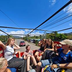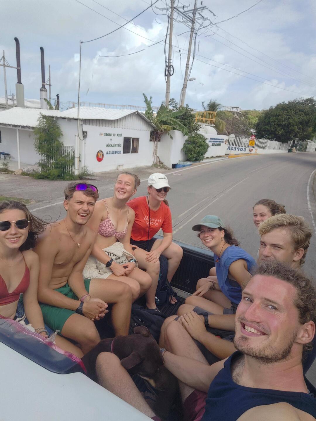 'The bus' consisted of three pickups that were to drive us around the island. We split up accordingly and Timo also went with us to our pickup. When Roland briefly asked if this was our dog, the students replied - quite naturally - with "Yes, of course". Timo hopped into our pickup and visibly enjoyed the unusual excursion 🐶