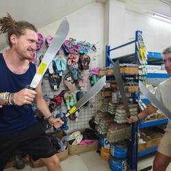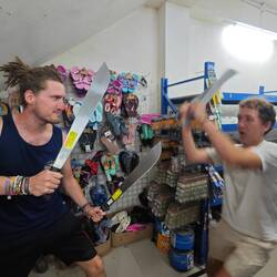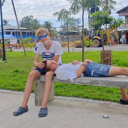 Then we headed back to the village. On the way, I had a chat with a local who wanted to know where we had come from and what all this was about. Once we arrived in the village, Lisa, Nicola and I went to an air-conditioned café, drank a smoothie and ate sweet local pastries. We decided to hire scooters for the day to explore the island on our own (a 40-minute tour of the island). Meanwhile, the kids had free-shore-leave time 🆓
