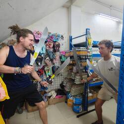 As sunrise was imminent, I went for a walk around the island and took in the beauty of 'our island' once again. Afterwards, more and more students came out of their tents and hammocks and gathered around the campfire site. As there were many sprouting coconuts on the island, I used the time to choose 'my coconut'. For a few days now, I have been planning to try and take a palm tree home across the Atlantic at least once. However, the likelihood of this plan succeeding is not particularly high - but it's worth a try. I was supported in this endeavor by my jury, who first had to choose the right coconut and then give it a name. 'Xerdinand' came out on top against A. Moll and Dritte Wahl. A. Moll (pupil) then took on the runner-up A. Moll (coconut) onto the ship as well. Leonore then decorated Xerdinand with some paintings and now we'll see what happens 🌴