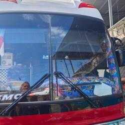 Nach einer verhältnismäßig kurzen Nacht klingelte mein Wecker um 07:00 Uhr. Ich hatte am gestrigen Tag bereits Arne darum gebeten, ob er mich gegen 07:30 Uhr an Land fahren könne. Nachdem ich meine letzten Sachen gepackt und mich von einigen Schüler*innen, die bereits auf dem Maindeck saßen, verabschiedet hatte, kam er dann - ohne dass ich ihn wecken musste - dieser Bitte nach. Wir fuhren noch eine 'Ehrenrunde' um die Regina und dann ging es Richtung Isla Colon. Arne setzte mich an der Transportstation der Schnellboote ab und ich ging zunächst noch etwas Verpflegung für den Tag einkaufen. Pünktlich um 08:30 Uhr ging es mit dem Schnellboot vom 'Caribe Shuttle Service' rüber nach Almirante. Dort gab es einen Umstieg von Boot zu Kleinbus und alle Mitreisenden und ich erreichten pünktlich nach einer Stunde die Grenzstadt 'Guabito' 🚤 🚌