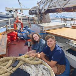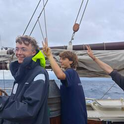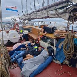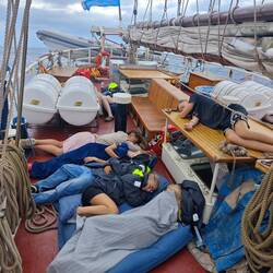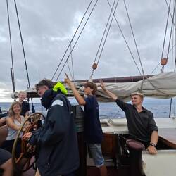For me, 31.01.25 began with a courageous clinging to all the walls my cabin had to offer. It's not unusual for a ship to be tilted for a short time. However, if this inclination (portside) lasts for about a minute, it is clear that something is wrong. I could only watch as half of the belongings shot out into our hallway and looked for a new place. At some point, we tipped back to starboard and I walked carefully up the stairs to the main deck. There I could already see a lot of commotion and people running around. The reason: we had come into a 'squall' that briefly gave us up to 11 knots. As we couldn't lower the sails in time, our mainsail tore as a result of this natural phenomenon, our outer jib knotted and the boom of the basan sail burst open 🌀