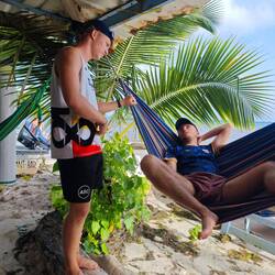 The whole atmosphere on the island - from lying in water hammocks to falling over backwards into the water at our water pavilion 🏖️