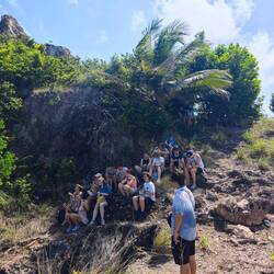 After another brilliant breakfast from Rainer, we went ashore in the dinghy at 10:30 am. After the last load had arrived, we set off at 11.00 am on a group hike to 'Morgan's Head' on the north-western edge of the island. As it turned out, a faithful companion followed us on our way and caused a veritable wave of care among all the students. Quickly given the name 'Timo', 'our' dog walked with us over hill and dale to our destination. There we found a beautiful view of a nearby bay and took a break for about 40 minutes. Some used this time to eat their packed lunch or to explore the surrounding area a little more 🚶🏽