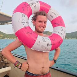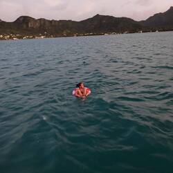 Nach einer kurzen Einkaufstour ging es für alle mit dem Dingi zurück aufs Schiff und wir nutzten - vielleicht schon das letzte Mal auf dieser Reise - die Gelegenheit vor Anker und vom Boot aus ins kühle Nass zu springen. Deshalb war es nun auch nötigste Zeit, meinen Rettungsring, den ich vor Abfahrt von meinen Freunden geschenkt bekommen hatte, auszuprobieren. So verbrachten wir die Zeit der letzten Sonnenstrahlen im Wasser und freuten uns schon auf das Abendprogramm: ein gemeinsamer Filmabend mit 'Moana 2' 🛟💿