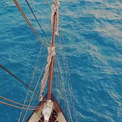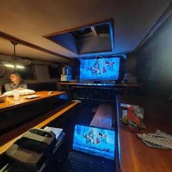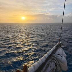 Der 31.01.25 begann für mich mit einem beherzten Festklammern an alle Wände, die meine Cabin zu bieten hat. Eine kurzzeitige Schräglage ist nichts unübliches am Schiff. Wenn diese Schräglage (Portside) allerdings etwa 1 Minute anhält, ist klar, dass hier etwas nicht stimmt. Ich konnte nur zusehen, wie die Hälfte des Hab und Guts in unseren Flur hinausschoss und sich einen neuen Platz suchte. Irgendwann kippten wir dann zurück nach Steuerbord und ich ging bedächtig die Treppe zum Maindeck hoch. Dort sah ich bereits sehr viel Aufruhr und umherlaufende Personen. Der Grund: Wir waren in einen 'Squall' gekommen, der uns kurzfristig bis zu 11 Knoten bescherte. Da wir nicht mehr rechtzeitig die Segel heruntersetzen konnten, riss infolge dieses Naturereignisses unser Mainsail, unser Outerjib verknotete sich und der Baum vom Basansegel platzte auf 🌀
