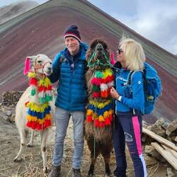 Unsere Planung passt, aber als wir den Vinicunca genau um 08.00 Uhr erreichen, sind wir doch nicht ganz unter uns. Zwei, drei kleinere Reisebusse aus Quito haben ihre Gäste schon abgeladen, um 02.30 Uhr erwachte für sie bereits der Tag im Dunkeln. Trotzdem, unsere Blicke auf die wunderschön angeordneten Farben bleiben ungetrübt und farbenfroh, auch die Sonne blinzelt angenehm warm zwischen den Wolken hindurch. Ein paar Touristenfotos mit den Lamas sind wohl ein ‘Must’. Gerade noch, kann ich die Besitzerin davon abhalten, den Tieren Sonnenbrillen alla «Blues Brothers» aufzusetzen.