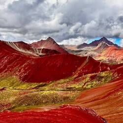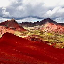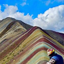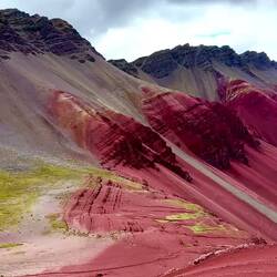 Wer sich die Frage stellt, wer den Regenbogen über den Vinicunca so kunstvoll bemalt hat: Die Farben entstehen durch verschieden überlagerte Mineralien. Diese Sedimentschichten haben sich über Jahrmillionen gebildet und wurden durch die Plattentektonik von einer waagerechten in eine fast senkrechte Position gedrückt. Das enthaltene Eisenoxidpigment ist rötlich, oxidiertes Mangan präsentiert sich in Pinktönen, gelbliche Farbtöne werden durch elementaren Schwefel oder auch Schwefelverbindungen hervorgerufen. Die Reaktion von Kupfer mit Wasser und Sauerstoff führt zu den bekannten, blaugrünen Verfärbungen. Das Vorkommen von Granit erklärt die schwarzen Streifen.Læs mere